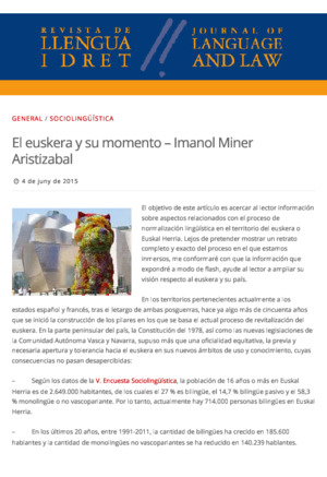(RLD blog, 2015-06-04)El objetivo de este artículo es acercar al lector información sobre aspectos relacionados con el proceso de normalización lingüística en el territorio del euskera o Euskal Herria. Lejos de pretender ... -