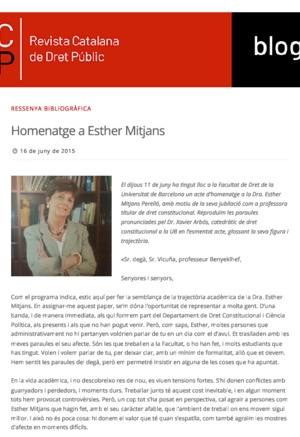 (RCDP blog, 2015-06-16)El dijous 11 de juny ha tingut lloc a la Facultat de Dret de la Universitat de Barcelona un acte d’homenatge a la Dra. Esther Mitjans Perelló, amb motiu de la seva jubilació com a professora titular de ... -