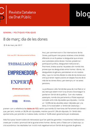 (RCDP blog, 2017-03-08)Avui, per commemorar el Dia Internacional de les Dones, publiquem tres peces relatives a tres àmbits diferents on es fa palesa la desigualtat que encara avui subsisteix entre dones i homes: presència i ... -