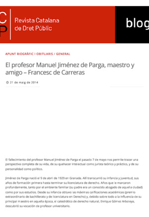(RCDP blog, 2014-05-21)El fallecimiento del profesor Manuel Jiménez de Parga el pasado 7 de mayo nos permite trazar una perspectiva completa de su vida, de su quehacer intelectual como jurista teórico y práctico, y de su ...